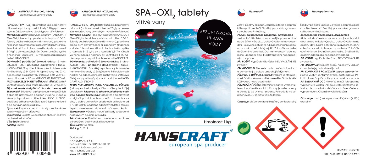 Návod k použití: Před prvním použitím HANSCRAFT OXI2 TABLETY vždy upravte hodnotu pH na 6,8–7,6. Tablety dávkujte sběračem (skimmerem), plovákem nebo jiným dávkovačem při zapnutém filtračním zařízení. Je nutné udržovat obsah volného kyslíku v rozmezí 8–15 g/l a pH v rozmezí 6,8–7,6. Obsah volného kyslíku a hodnotu pH kontrolujte 1–2× týdně pomocí příslušných testerů HANSCRAFT.