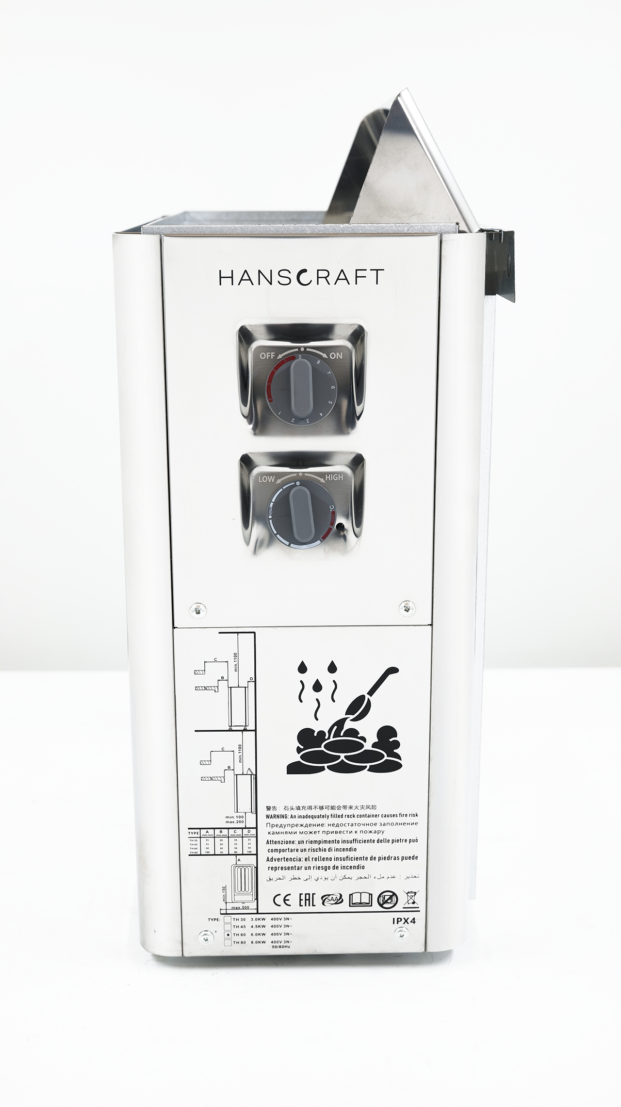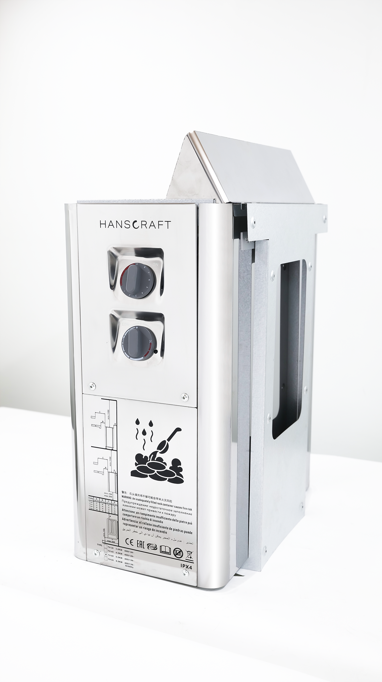 Součástí výbavy jsou kamna Hanscraft 4,5kW s integrovaným WIFI ovládáním, která umožňují snadné a intuitivní nastavení teploty přímo uvnitř sauny. Kamna se rychle nahřívají, udržují stabilní výkon a svým designem perfektně doplňují dřevěný interiér.