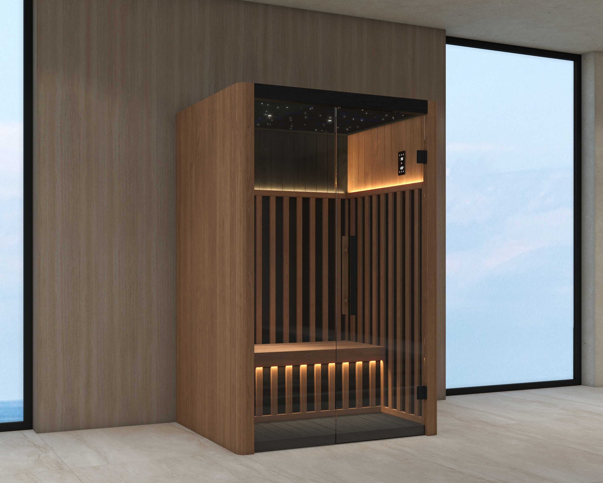 Tato sauna je navržena s důrazem na moderní estetiku i maximální komfort. Dominantou interiéru je hvězdný strop s černou základnou, který vytváří atmosféru naprostého klidu. Vnější i spodní části jsou ošetřeny Black Sauna Wax, což dodává elegantní vzhled a zároveň zvyšuje odolnost materiálu. O snadné ovládání funkcí se stará PTAT controller, díky němuž lze přizpůsobit prostředí přesně podle vašich potřeb.