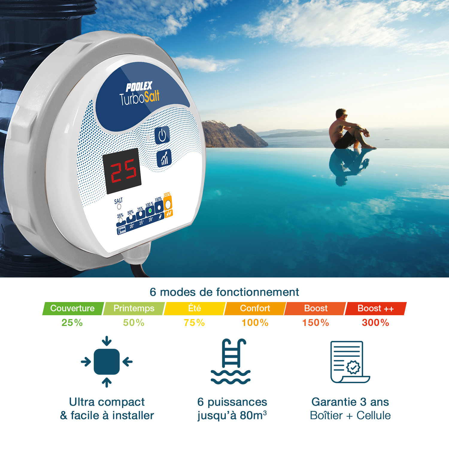 Dostupné pro bazény do 40m3. Turbo Salt je dodáván s připojením 50 mm (1' 1/2) a adaptéry 32/38 mm. Díky jeho upevnění na stěnu nebo podlahu se tento elektrolyzér přizpůsobí všem typům filtrace a jeho ultra-kompaktní velikost umožňuje instalaci i v nejmenších technických místnostech.